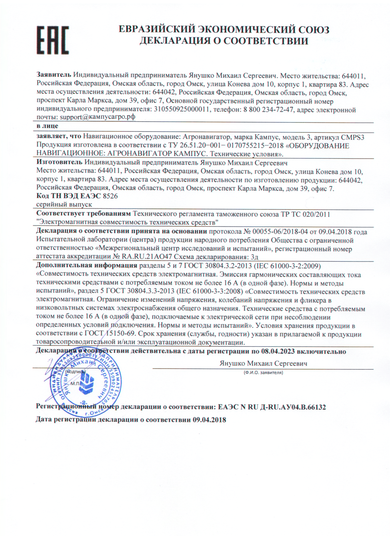 Использование агронавигатора «Кампус» увеличивает точность процесса обработки поля и исключает вероятность возникновения необработанных участков полей или перекрытий, дает возможность выполнять обработку в ночные часы, во время тумана и при недостаточной видимости.